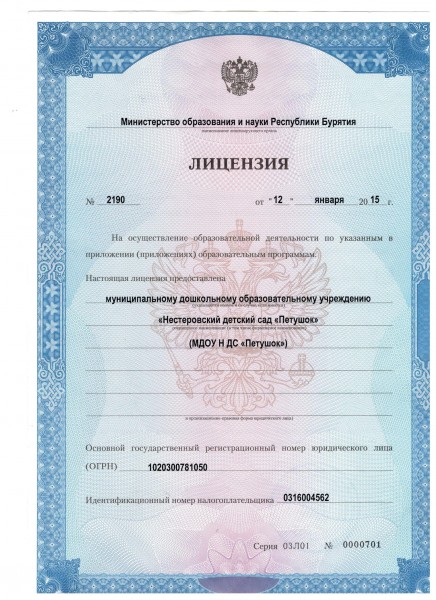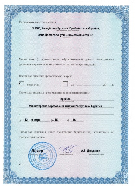 | Адрес местонахождения образовательной организации* | 671265, Республика Бурятия, р-н Прибайкальский, С.Нестерово, Комсомольская ул.32 К.А, |